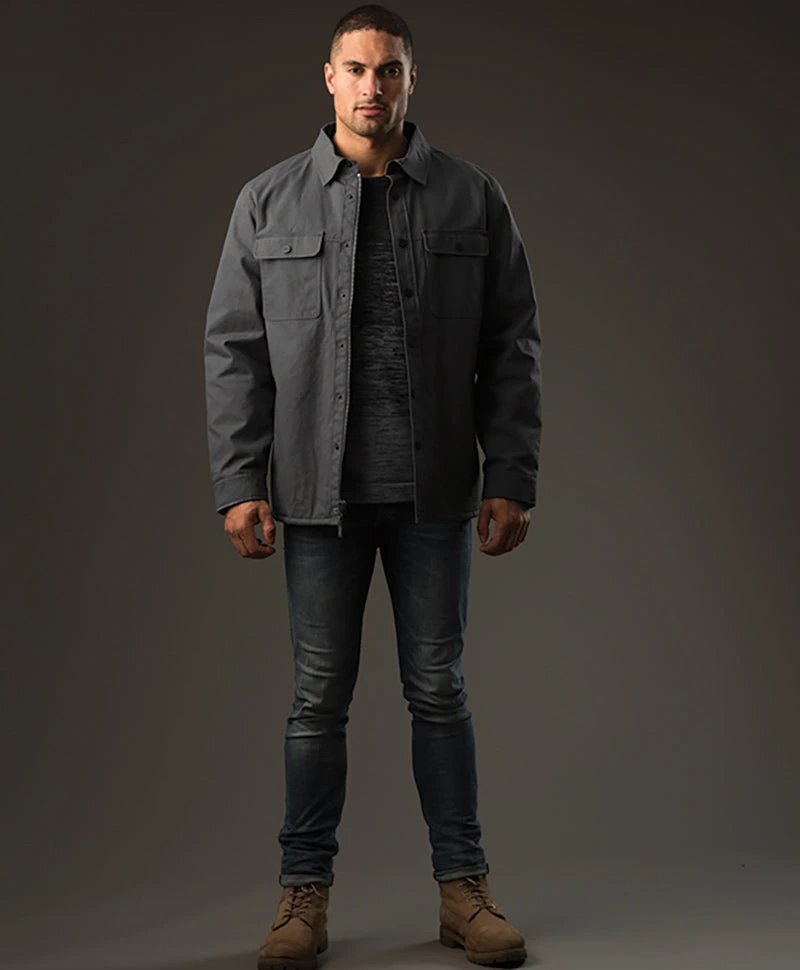 Rugged and highly durable, with a water-repellent finish, sherpa fleece lining and light thermal fill for added warmth. This workwear-ready jacket features double chest pockets, self fabric collar and a contemporary fashion-forward design.